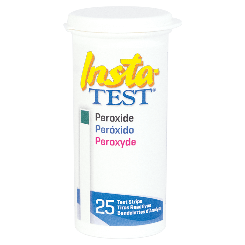 La tira de Peróxido Insta-TEST® (Biguanide Shock) mide niveles de peróxido desde 0 hasta 90 ppm. Esta tira reactiva es una tira de inmersión y lectura con resultados en 10 segundos.