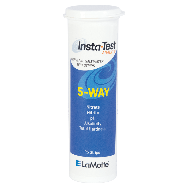 Las tiras de 5 vías de Insta-TEST® proporcionan resultados rápidos para nitrato, nitrito, pH, alcalinidad y dureza total.