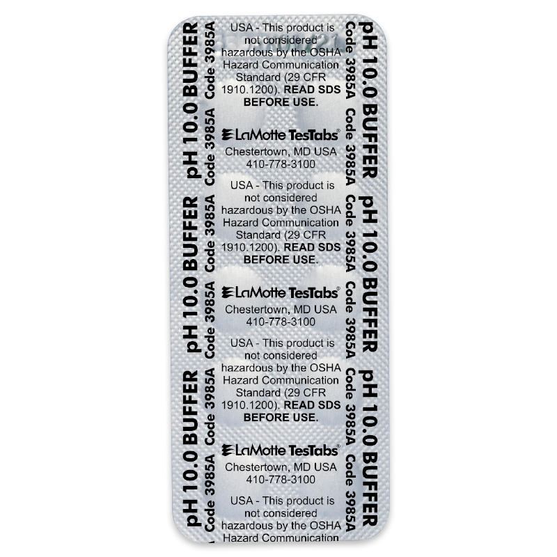 El envase tipo papel de aluminio tipo ampolla TesTabs® Tablets de LaMotte permite a los usuarios dispensar una tableta en un pequeño frasco presionando la tableta a través del papel de aluminio. Añade una pastilla a 20 mL de agua desionizada para producir amortiguadores. Disponible en packs de 50 y 100 tabletas. En tiras de papel de aluminio de 10 tabletas cada una.
