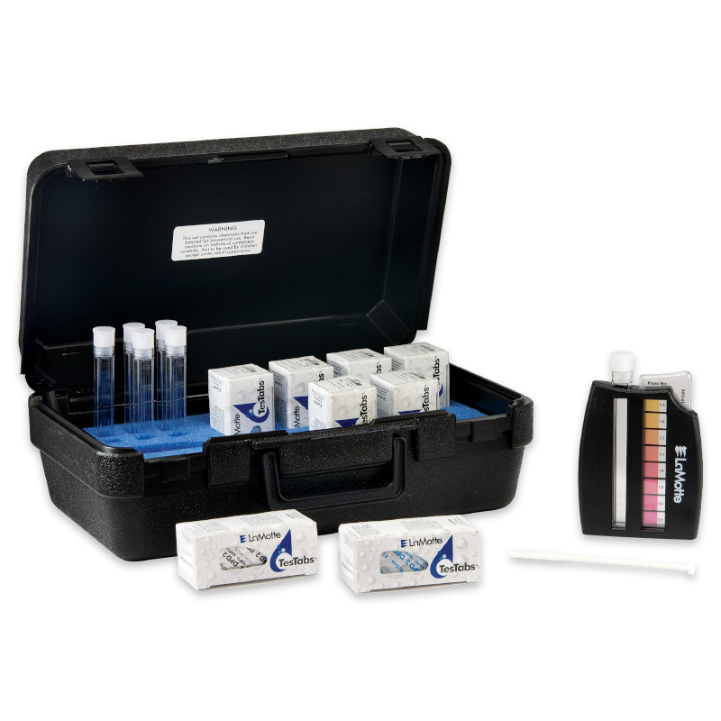 Este kit se utiliza para analizar cloro libre disponible, monocloramina, dicloramina, cloro residual total y pH utilizando tabletas de DPD, tablas de fenol rojo y el comparador Octa-Slide 2. Rango y sensibilidad son Bajos: 0,1-1,0 ppm Cl, Alto: 1,0-6,0 ppm Cl, pH: 6,8-8,2.