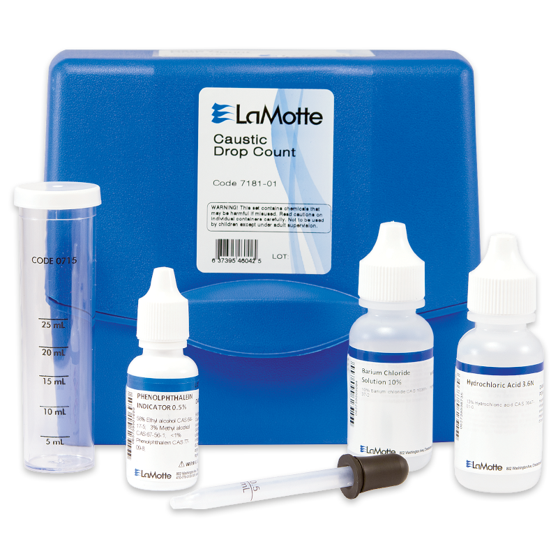 Este kit demuestra los niveles cáusticos añadiendo gotas de solución de cloruro de bario a una muestra donde se formará precipitado blanco si hay carbonatos. A continuación, los niveles se determinan utilizando el indicador de fenolftaleína. El rango y la sensibilidad son 1 gota = 0,1 o 1% de NaOH.